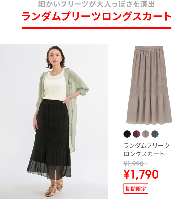 【本日よりSUMMER SALEスタート】トレンドのランダムプリーツロングスカートが特別価格¥1,790でお買い得